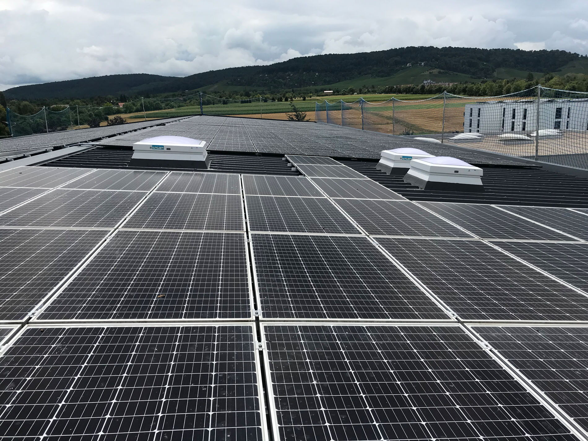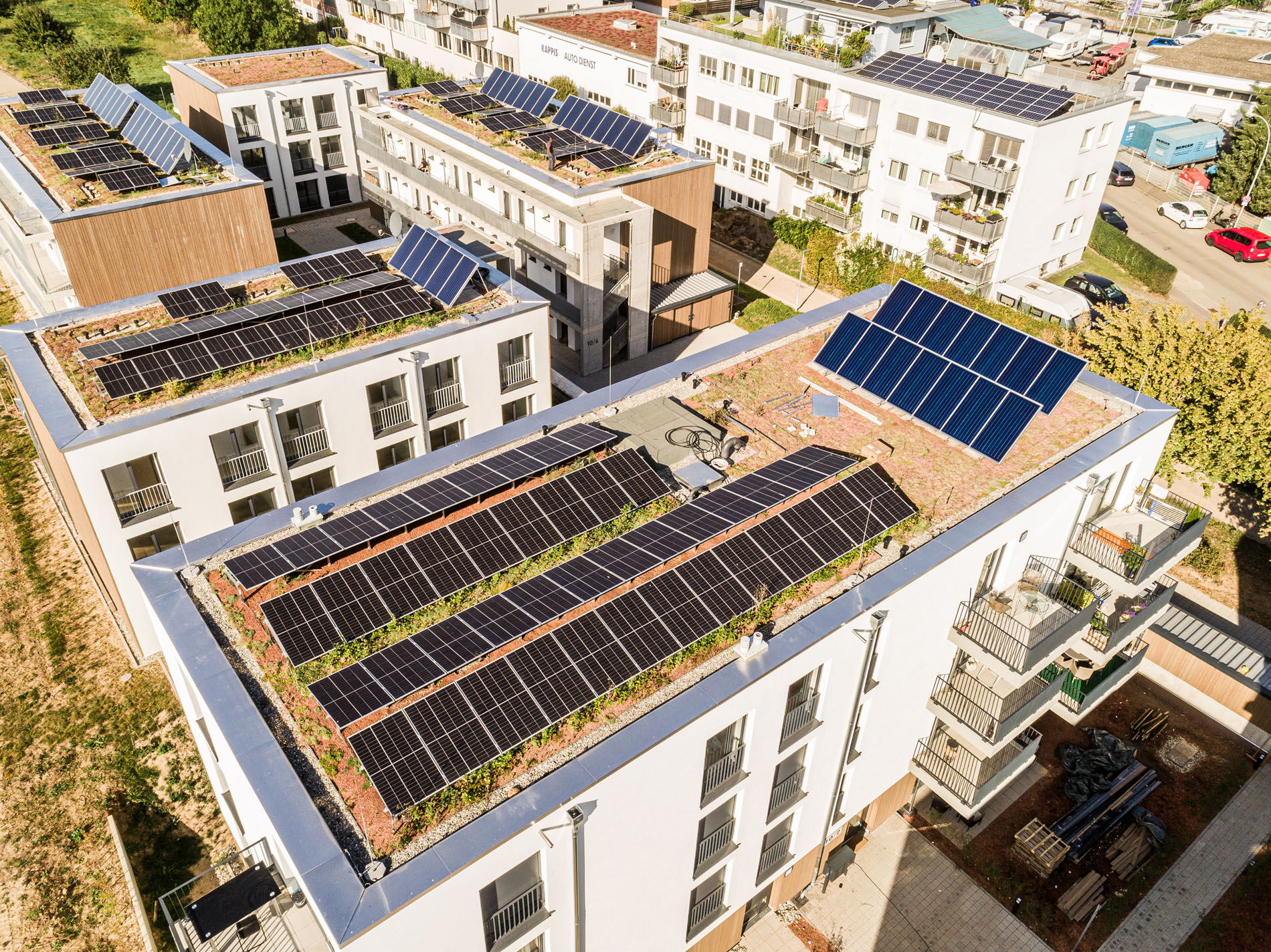 Neubauprojekt Wiesenäcker der WDF: Umsetzung der Innovativen Strom- und Wärmeversorgung mit einer installierten PV-Leistung von 81,04 kWp, 200 Solarmodulen, Abwasserwärmetauscher und Wärmepumpen.